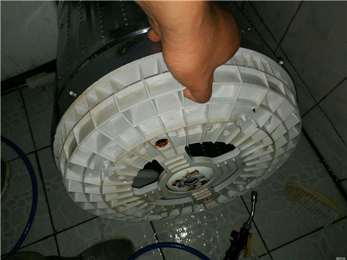 2、再擰開洗衣機底部的螺栓,最好的選擇是使用活絡扳手。取下螺栓后放可搖一搖內(nèi)桶,無需等待太久內(nèi)桶就可輕松提出。不要認為平?吹絻(nèi)桶的內(nèi)壁都很干凈,其實是非常臟的,特別是將底部內(nèi)桶取下后,可看到這個最臟的外桶上面還是黏附有很多污垢。外桶不用取下,因為下面還連接著排水管和電源線,為的是怕取出時會將其損壞。可以選擇使用水桶接水往里倒,然后用刷子就行刷洗。刷完之后需要打開電源,并直接選擇脫水,使污水可以排出,這里需要反復幾次同樣的步驟。