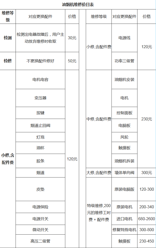 油煙機不同規(guī)格和各種故障的不同維修費用也是不一樣的,下面為油煙機維修的價目表,可供參考: