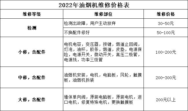 油煙機(jī)維修要多少錢呢?油煙機(jī)的維修價(jià)格與具體的故障有關(guān),價(jià)格可參考下表:
