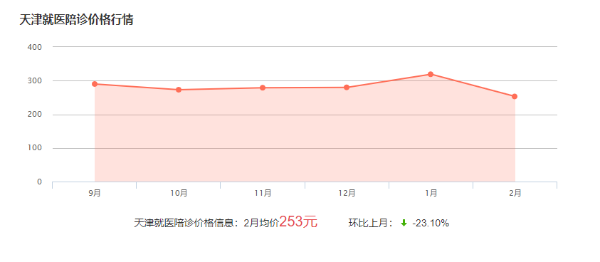 在天津醫(yī)院陪診的費(fèi)用一般在200-500元左右,具體與陪診的時(shí)長、內(nèi)容等因素有關(guān),下面為推薦近幾個(gè)月陪診的費(fèi)用波動(dòng)圖,僅供參考:
