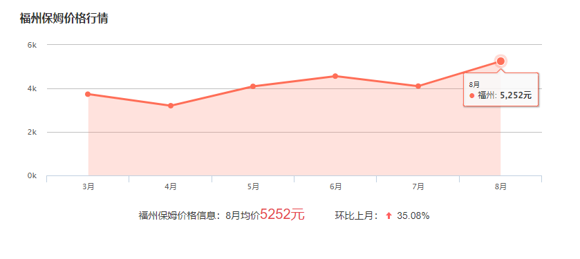 福州找住家保姆的費用一般在4000-8000元左右,具體的價格取決于保姆的經(jīng)驗和能力及雇主家庭人員的情況及工資內(nèi)容。下面為近幾個月福州保姆的價格波動圖,僅供參考:
