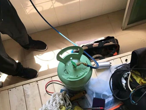 2、測(cè)壓力法:將空調(diào)置于制冷高速風(fēng)狀況(冬季,制熱需求加氟時(shí),將空調(diào)設(shè)置于強(qiáng)制制冷狀況或?qū)⑹覝貍鞲衅髦糜?7℃左右的溫水中,模仿夏天溫度讓空調(diào)處于制冷狀況)下作業(yè),在低壓截止閥工藝口,邊加氟邊調(diào)查真空壓力表的低壓壓力,當(dāng)?shù)蛪涸?.49MPa(夏天)或0.25MPa(冬季),封閉氟瓶閥門(mén)。