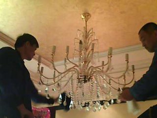 5,梯子上的人摘完水晶球后`用毛巾把電鍍燈架擦凈。