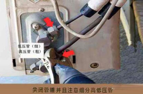 1、首先收氟:打開空調(diào)制冷,溫度調(diào)到最低(為的是防止空調(diào)溫度到達(dá)停止工作)冬季屋內(nèi)溫度低不能制冷的話,用熱毛巾蒙住溫度感應(yīng)頭,等待運(yùn)轉(zhuǎn)5到10分鐘,壓縮機(jī)運(yùn)轉(zhuǎn)一切正常后關(guān)閉高壓閥,方法是用活扳手代開氣體管接口上的保護(hù)帽,用5個的內(nèi)六角把高壓管閥門(細(xì))順時針關(guān)閉,最等1-2分鐘管壁上面結(jié)水珠時關(guān)閉低壓閥門(粗的),方法同以上一樣,同事關(guān)閉空調(diào),拔下220V電源插頭,這樣收氟工作完成。
