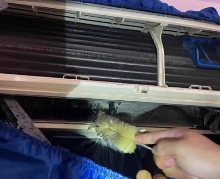 拆卸空調(diào)外機:將空調(diào)外機拆卸下來,用高壓水槍沖洗外機表面,再用刷子清理散熱片。